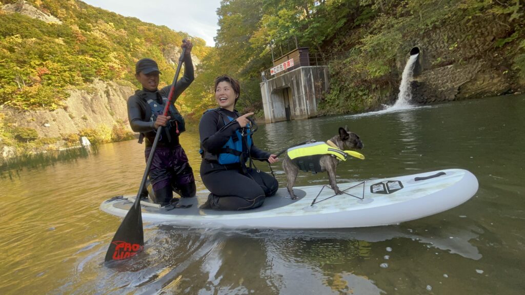 漕ぎ方、乗り方全て教えますし、最初はガイドがワンちゃんを預かった状態で乗り慣れてきたら自分の前に乗せる!
