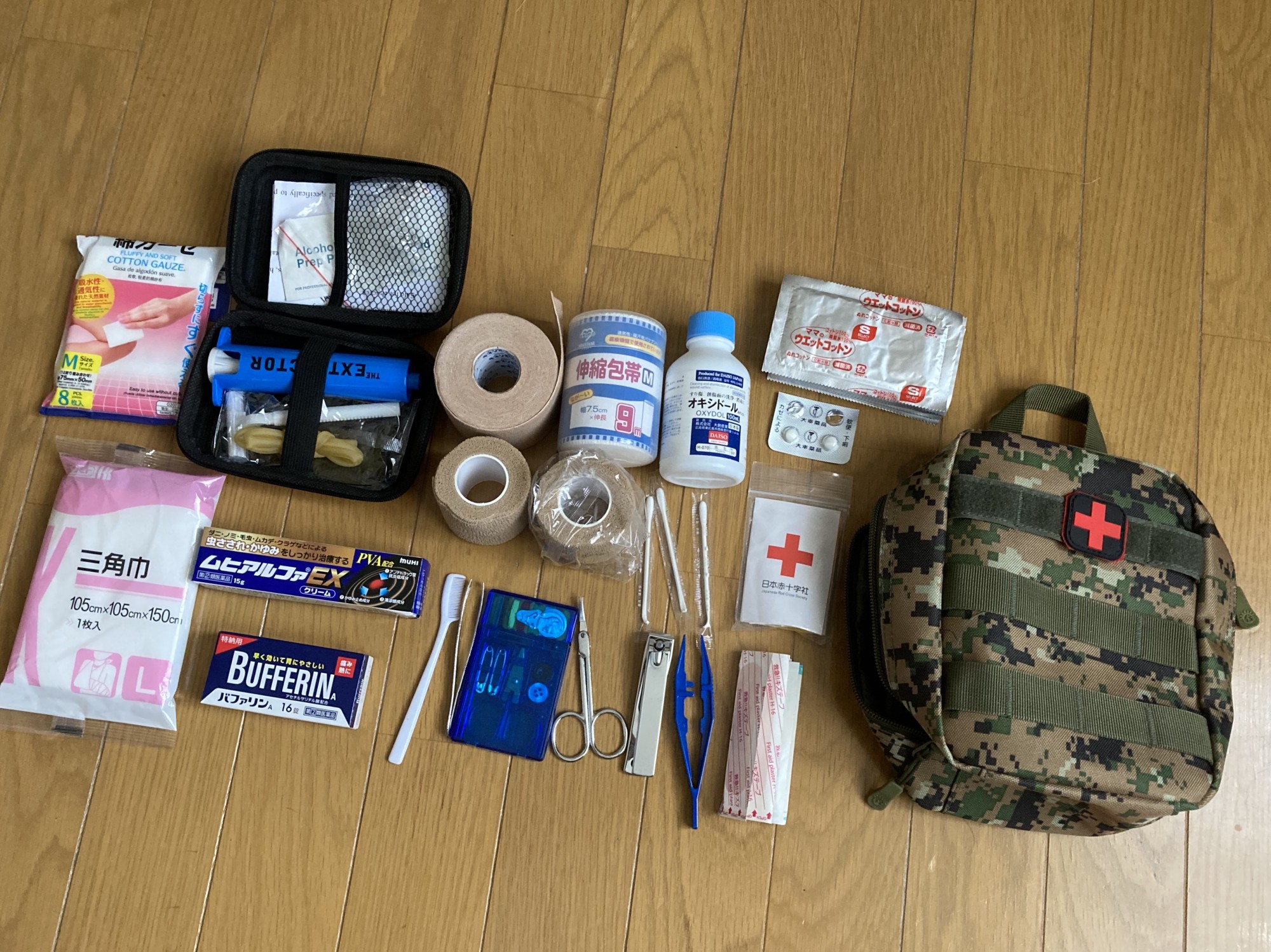 三角巾やポイズンリムーバー、鎮痛剤、コットンなどなど